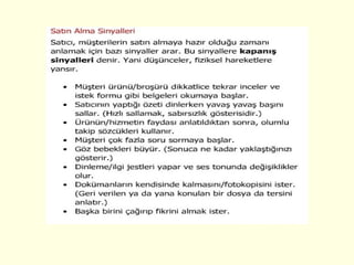 KONUŞU-RKEN Her cümlekarşınızdakini yakından ilgilendirsin, onların ihtiyaçlarına yönelik bilgiler ihtiva etsin. Ayrıntılarla muhataplarınızı sıkıntıdan patlatmayın, ilginç ayrıntılara yer verin. Muhataplarınızın yüzüne, hatta gözlerinin içine bakın:asla mırıldanarak konuşmayın. Üç cümlenizden birisi soru cümlesi olsun, soru cümleleri muhatapları uyanık tutar. Dinleyicilerinizi usulüyle övün , etkileyiciliğiniz % 50 artar. Asla ezberlenmiş bir konuşmayı mekanik tarzda sunmayın.. Anlatacağınız konu hakkında heyecanlı, arzulu ve şevkli olun. Sorular çoksa , başarılı bir hatipsiniz demektir. Bu konuşmanın belki de en can alıcı cümlesine geldi sıra...”tarzında ifade(leri)niz mutlaka bulunsun ve o cümle hakikaten can alıcı olsun. Abartmamak lazım ! Maddive psikolojik tüm ihtiyaçlar Satış sinyali Sakin olun Düşünün Bekleyin
