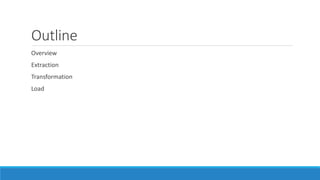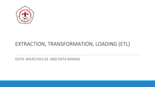 Proses ETL (ekstraksi, transformasi, dan pengumpulan data) merupakan proses penting dalam membangun gudang data. Proses ini melibatkan ekstraksi data dari berbagai sumber, transformasi data untuk meningkatkan kualitas dan konsistensi, serta pengumpulan data ke dalam gudang data. Tantangan utama dalam ETL adalah heterogenitas sumber data dan memperbaiki kualitas data selama proses transformasi.
