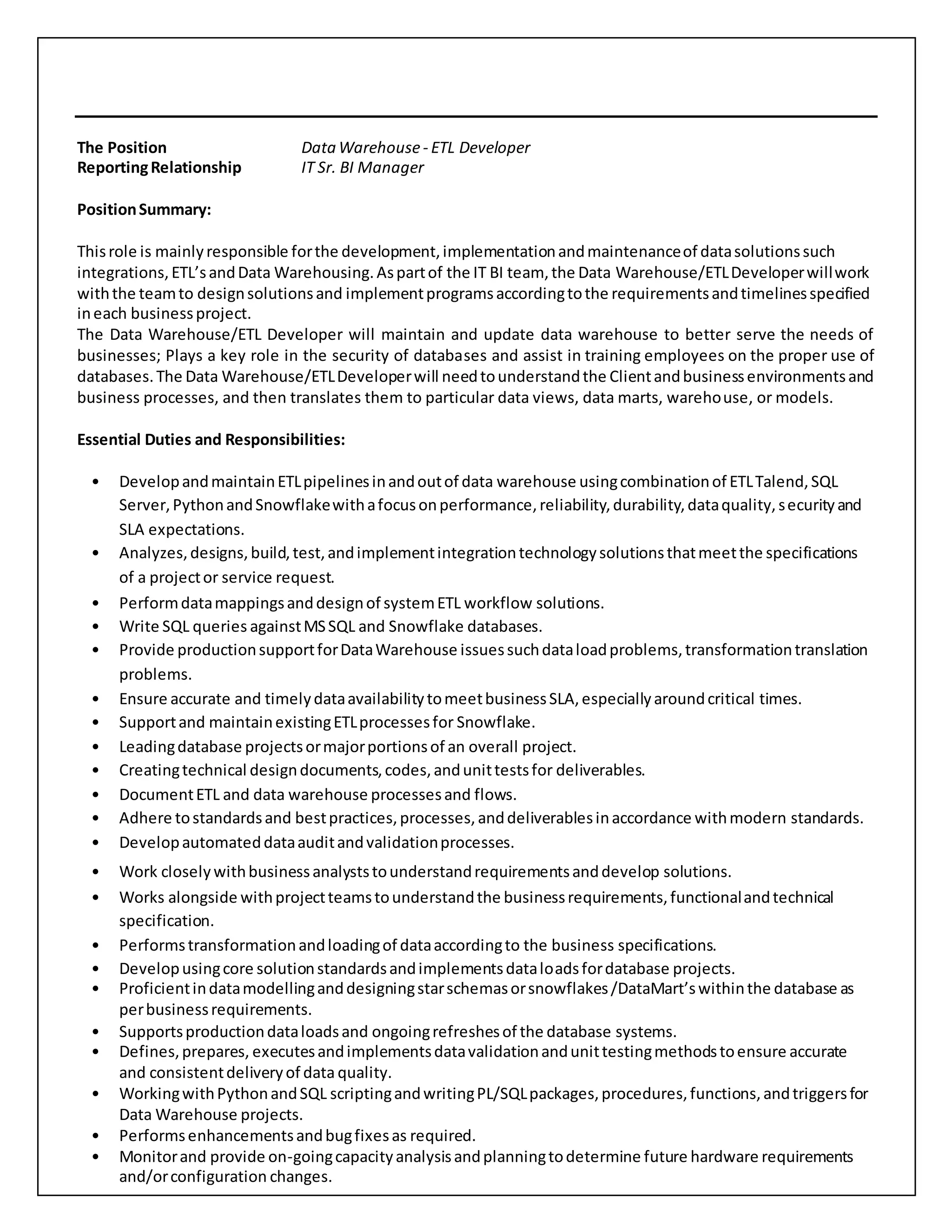 This role is responsible for developing, implementing, and maintaining data solutions such as integrations, ETLs, and the data warehouse. As part of the IT BI team, the Data Warehouse/ETL Developer will design solutions and implement programs according to project requirements and timelines. The developer will maintain and update the data warehouse to serve business needs, and assist with database security and training. Responsibilities include developing and maintaining ETL pipelines, performing data mapping and workflow design, writing SQL queries, and ensuring accurate and timely data availability. Strong experience with databases, data warehousing, ETL tools like Talend, SQL, and Snowflake is required.