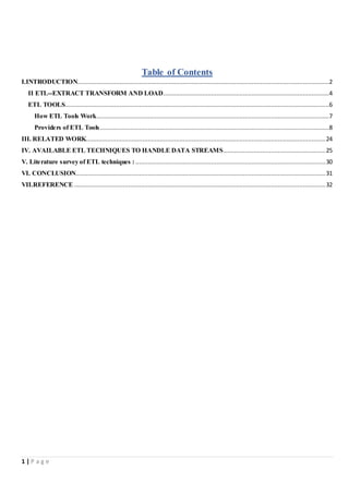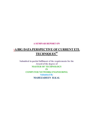 This document provides an overview of current ETL techniques from a big data perspective. It discusses the evolution of ETL from traditional batch-based techniques to near real-time and real-time approaches. However, existing real-time ETL approaches are inadequate to address the volume, velocity, and variety characteristics of data streams. The document also surveys available ETL tools and techniques for handling data streams, and concludes that the ETL process needs to be redefined to better address issues in processing dynamic data streams.