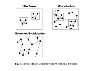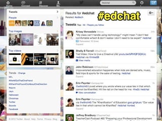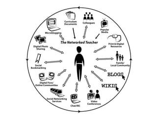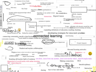 The document discusses connected learning and the shifts in educational technology, emphasizing the importance of adapting to an information-rich, networked reality. It explores concepts such as collaboration, informal learning, and the role of social networks in fostering innovation and knowledge sharing. The concluding thoughts reflect on the paradigm shift in how people connect and learn in contemporary society, questioning the implications for education and the potential for digital divides.