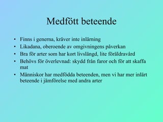 Medfött beteende Finnsi generna, kräver inte inlärning Likadana, oberoende av omgivningens påverkan Bra för arter som har kort livslängd, lite föräldravård Behövs för överlevnad: skydd från faror och för att skaffa mat Människor har medfödda beteenden, men vi har mer inlärt beteende i jämförelse med andra arter