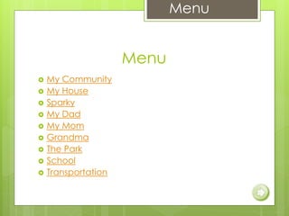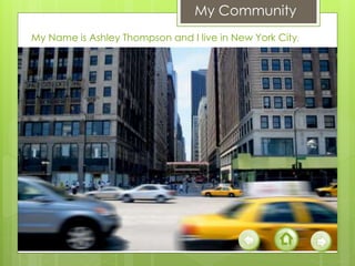 Ashley Thompson lives in an apartment in New York City with her family. She describes her home, dog Sparky who works at the fire station with her father, who is a firefighter. Her mother is a nurse. Her grandma lives with them and takes her to the park and school every day. Ashley takes the subway or taxi with her family since they do not have a car.