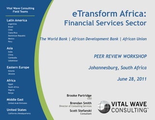 The document provides an analysis of challenges and opportunities for financial sector development in Africa, particularly focusing on the role of ICT to promote financial inclusion. It identifies various barriers such as consumer understanding, regulatory issues, and market maturity, while also highlighting significant trends in ICT that could support financial sector improvements. The report emphasizes the need for investments in infrastructure and innovative solutions to overcome existing challenges and enhance service delivery in the region.