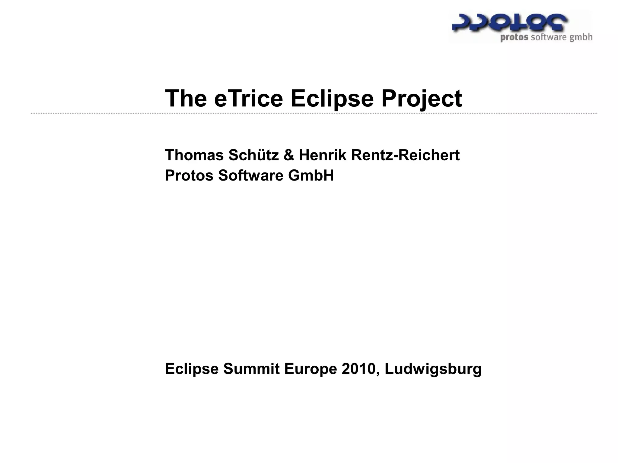 The eTrice Eclipse Project aims to provide modeling tools for embedded systems using the Real Time Object Oriented Modeling (ROOM) language. It will include graphical and textual editors for ROOM, code generators for multiple languages, and debugging support. The project is currently in an incubation phase, with prototypes of ROOM editors and code generation for Java. Future plans include expanding language support and gathering an open source community to contribute to the project.