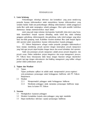 Dokumen ini merinci kerangka acuan kerja untuk pengembangan aplikasi berbasis web My Indihome oleh PT Telkom Banjarmasin, bertujuan untuk mempermudah registrasi dan pemantauan pemasangan layanan Indihome. Proses pengembangan mencakup beberapa tahapan mulai dari perencanaan hingga pengujian, dengan fokus pada pengelolaan proyek dan kolaborasi dengan berbagai pihak terkait. Selain itu, aplikasi dirancang untuk meningkatkan kepuasan pelanggan melalui informasi yang lebih mudah diakses dan sistem yang efisien.