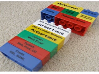The document discusses the concepts of the web as a platform, harnessing collective intelligence, and rich user experiences. It references several related web links and photos. It also touches on topics like perpetual beta, lightweight programming models, and architecture of participation.