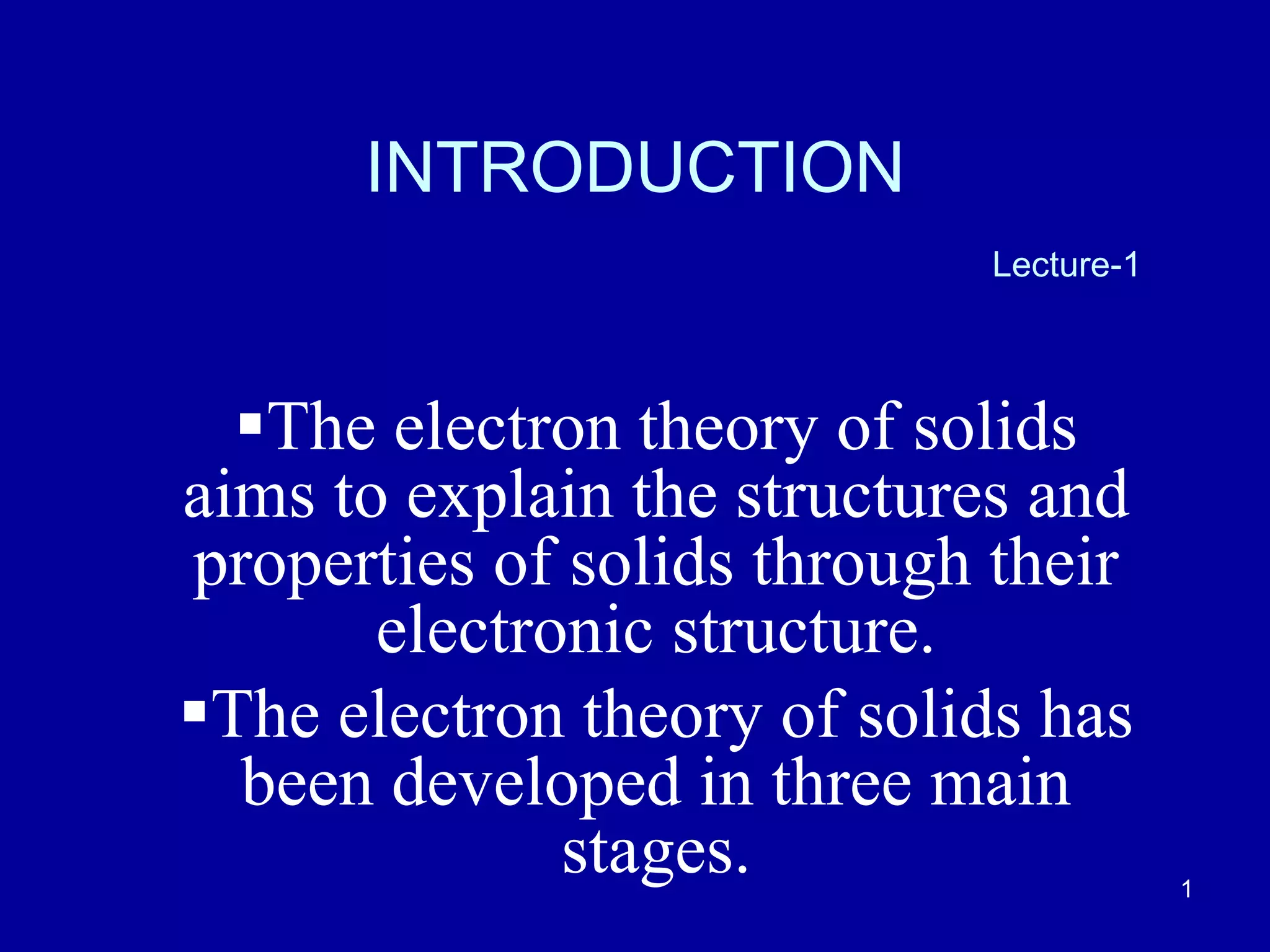 The electron theory of solids has developed in three stages: (1) the classical free electron theory developed by Drude and Lorentz in 1900, which treated electrons as a free gas obeying classical mechanics; (2) the quantum free electron theory developed by Sommerfeld in 1928, which treated electrons as obeying quantum laws; and (3) Bloch's zone theory from 1928, which treated electrons moving in a periodic potential from the lattice. The classical theory could explain properties like conductivity but had limitations, while the quantum theory improved explanations but new theories were still needed to explain new discoveries like semiconductors. Bands of allowed energy levels in solids help classify them as conductors, semiconductors or