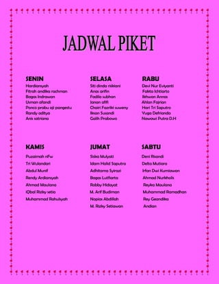 The document contains a schedule listing names for each day of the week from Monday to Saturday. There are 11 names listed for each weekday and 10 names listed for Saturday. The names appear to be Indonesian.