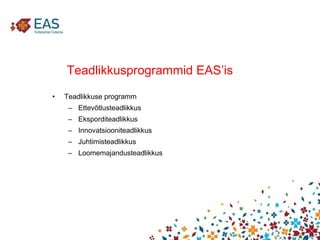 Põhimõtted toetada projekte ja protsesse, mis täidavad programmi eesmärki ning mille toetamine aitab suurendada nende tegevuste efektiivsust; hankida tegevusi, mille vajadust EAS tunnetab, kuid mille elluviimiseks puudub organisatsioonis ressurss, oskusteave või on turul olemas tegijad, kes suudavad tegevust ellu viia efektiivsemalt, kui EAS; initsieerida ja vedada projekte ja protsesse, mille vajadust EAS tunnetab, kuid mille elluviimiseks puudub turul efektiivsem tegija, või tulenevalt tegevuse iseloomust ei ole seda võimalik hankida väljastpoolt organisatsiooni.