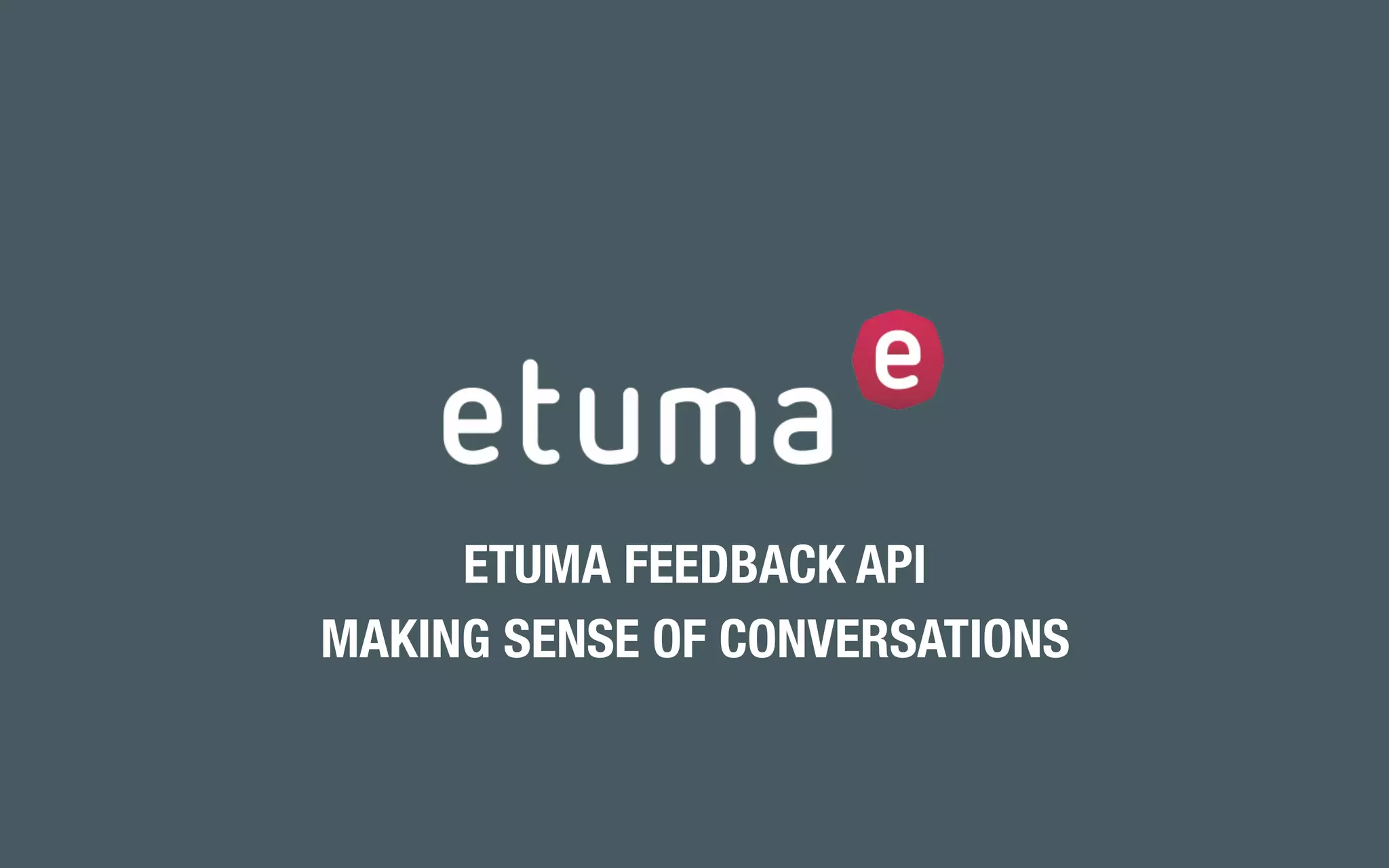 The document outlines Etuma's feedback analysis API, which offers topic and sentiment analysis for enterprises without visualization or reporting features. It provides various API options for integration and details the types of data analyzed, including discussion topics and sentiment ratings. Additionally, it emphasizes the technology behind the system, including advanced language processing capabilities and customization options.