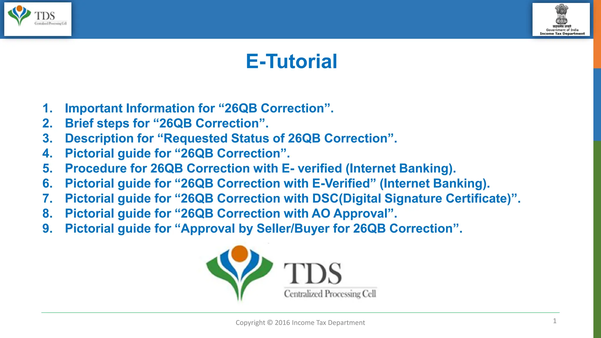 This document provides step-by-step instructions and pictorial guides for submitting a correction request for Form 26QB through the Tax Information Network (TRACES) website. It outlines 9 steps for submitting a correction request, including selecting the correction option, entering required details, updating fields, confirming details, and submitting the request. It also describes the status updates users can expect and verification options if a digital signature is not registered, including E-Verification through internet banking.
