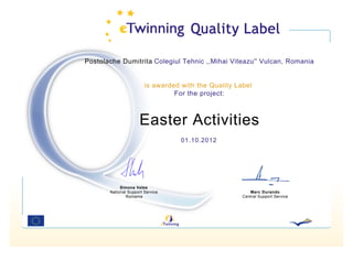 The Colegiul Tehnic ,,Mihai Viteazu'' Vulcan in Romania was awarded the Quality Label for their Easter Activities project from October 1, 2012. The award was signed by Simona Velea of the National Support Service of Romania and Marc Durando of the Central Support Service.