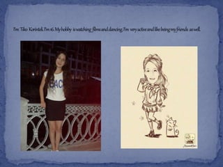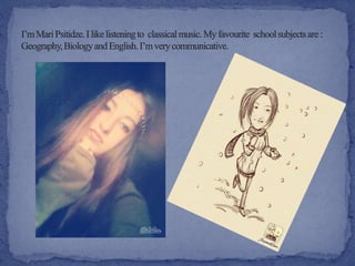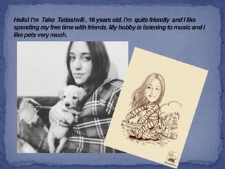 This document introduces two 16-year-old Georgian teenagers, Ana Shiukashvili and Ani Korinteli. Ana enjoys reading, spending time with friends, and playing sports like football and volleyball. Ani likes writing poems, going to the theater, playing table tennis, and listening to rap music. The document states that as Georgian teenagers they like new challenges, are tolerant, responsible, collaborative, and invites the reader to meet them.