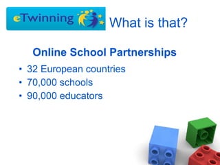The eTwinning initiative connects over 70,000 educators across 32 European countries to enhance primary school education through international collaboration and use of technology. It offers a platform for project management and content sharing while promoting cooperation, creativity, and experiential learning among students. eTwinning projects vary widely in scope, focusing on themes like culture, health, and creativity, and leverage modern tools such as social media for enhanced interaction and learning.