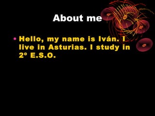 Ivan is a student from Asturias, Spain who enjoys playing football, basketball, and doing karate in his free time. He lives with his parents and sister and has two dogs and a cat as pets. At school, Ivan socializes with his friends Cristian, Saul, Juan, Jose, Guillermo, Laura, Elena, Ainhoa and others. In his free time, he uses Tuenti to chat with friends online.