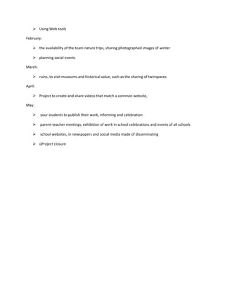 This document outlines the planned activities for an eTwinning school partnership project from October to May. It includes establishing project teams, designing logos, forming clubs, sharing work between partner schools, adding products to shared work spaces, promoting the partnership locally and nationally, organizing social events like nature trips and visits to historical sites, creating shared videos, publishing student work, and celebrating the partnership through exhibitions and events. The goal is for students and teachers to collaborate across schools on various activities and deepen their relationships over the course of the school year through the eTwinning platform and tools.