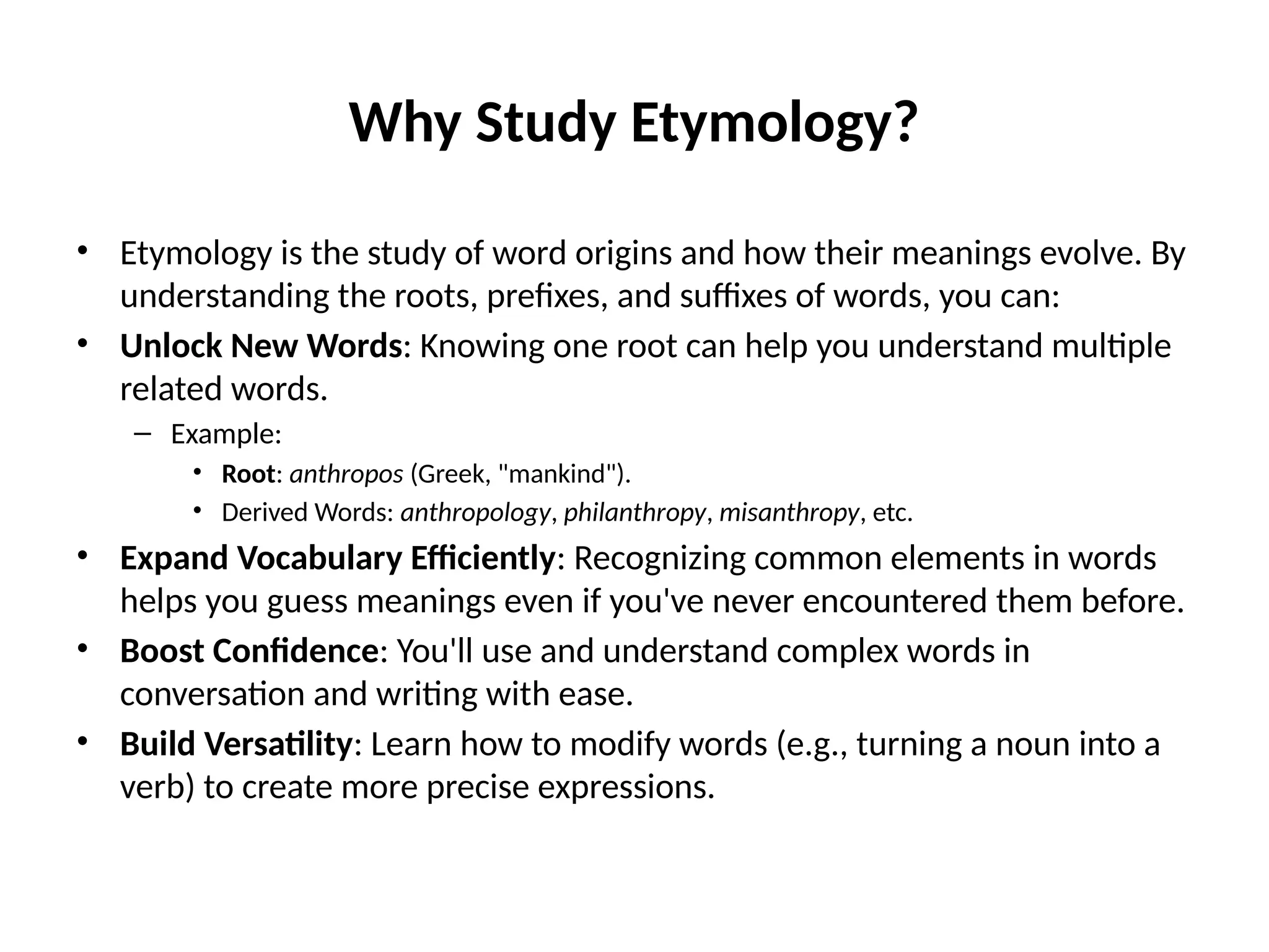 Etymology is the study of word origins and evolution that aids in vocabulary expansion, boosts confidence in using complex words, and enhances communication skills. Understanding the parts of speech and employing effective study methods, such as small sessions and regular reviews, can significantly improve retention and comprehension. By focusing on the structure and origins of words, learners can intuitively grasp meanings and use new vocabulary naturally.