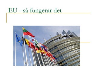 Hur arbetar EU?EU:s makt delas mellan fem institutioner; Ministerrådet (EU-ländernas regeringar) Är EU:s högsta beslutande organ! Består av en minister från varje medlemslands regering. Vilka ministrar som sammanträder beror på vilken fråga som behandlas. Beslutar om nya lagar. (Bryssel) Europeiska kommissionen (regering): Utför mycket av det dagliga arbetet inom EU. Förbereder beslut och ser till att dessa verkställs. Har 27 ledamöter, kommissionärer, dvs. en för varje medlemsland. Ordförande: José Manuel Barroso Europaparlamentet (riksdag): EU:s folkvalda organ. Har 785 ledamöter, varav 19/18 svenskar. Ledamöterna väljs vart femte år av medlemsländernas invånare. Alla ledamöter ingår i något av de 20 utskotten (ämnesområden). EG-domstolen: Övervakar att medlemsländerna följer EU:s grundlag samt de beslut som fattas. Europeiska revisionsrätten: granskar budgeten inom EU