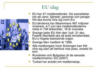EU idag EUhar 27 medlemsländer. De samarbetar om att varor, tjänster, personer och pengar fritt ska kunna röra sig inom EU. EU-länderna har tillsammans 497 miljoner invånare. 4-7 juni ska medlemsländerna rösta in 736 ledamöter, 18 är svenska. Sverige leder EU från den 1juli- 31 dec. Fredrik Reinfeldt ska då leda ministerrådet, EU:s högsta beslutande organ. Sverige blev medlem år 1995. Alla medborgare inom Schengen kan fritt röra sig utan att behöva visa pass, endast Id-kort. Rumänien och Bulgarien är de senaste medlemmarna i EU (2007) Turkiet har ansökt om medlemskap.