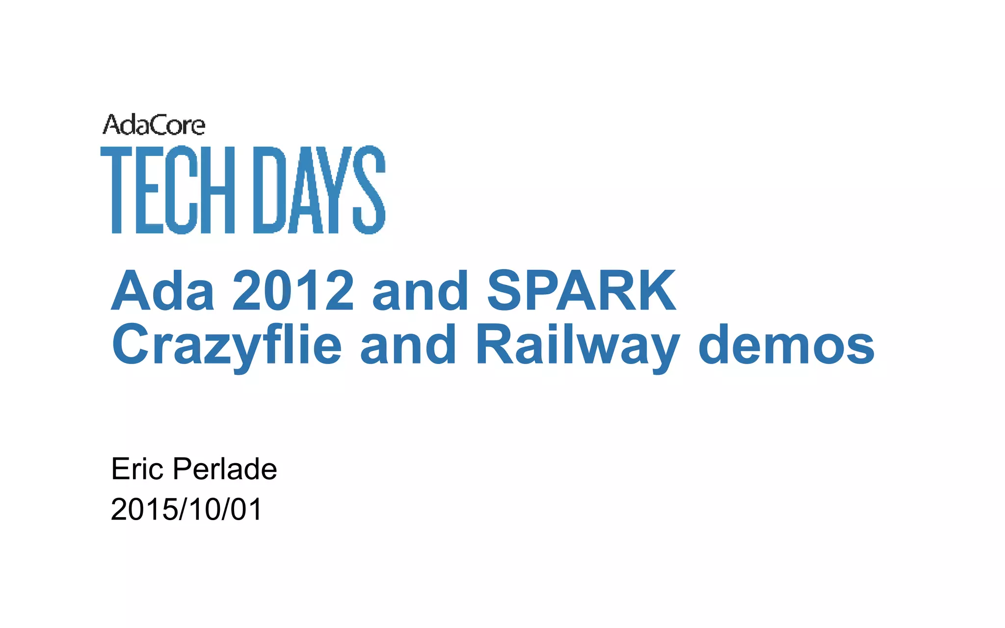 This document summarizes presentations given by Eric Perlade on using Ada 2012 and SPARK 2014 for safety-critical drone and railway signaling software. It describes reimplementing the stabilization system of the Crazyflie drone firmware in SPARK to prove absence of runtime errors. It also outlines plans to reimplement the entire drone firmware without C using Ada 2012 and SPARK. Additionally, it discusses a demonstration of using SPARK 2014 to model a railway signaling system and prove absence of collisions.