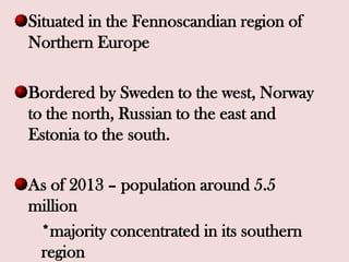1. Finland is located in Northern Europe, bordered by Sweden, Norway, Russia and Estonia, with a population of around 5.5 million concentrated in the southern region.