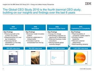 The document summarizes findings from IBM's 2010 Global CEO Study, which included interviews with over 1,500 CEOs globally. Key findings for the energy and utilities industry included:
