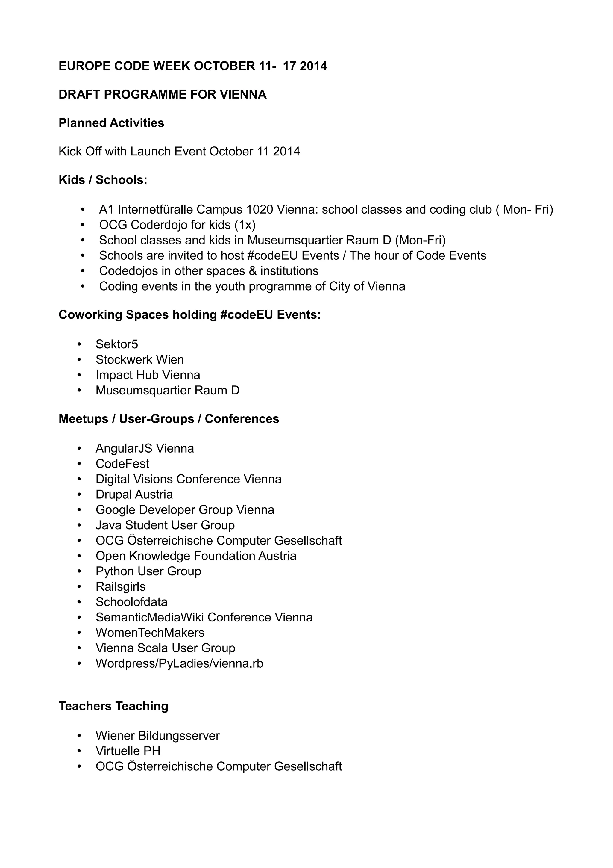 Europe Code Week was held from October 11-17, 2014 in Vienna with various coding activities planned. The week began with a launch event on October 11 and included coding clubs and classes for kids and schools throughout the week at locations like the A1 Internetfüralle Campus and Museumsquartier Raum D. Various coworking spaces in the city also hosted #codeEU events. Meetups, conferences, and user groups covered topics such as AngularJS, coding, data, and programming languages during the week to teach coding to different audiences. Teachers were also involved through organizations providing online and virtual resources.