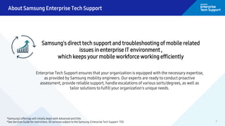 Samsung's Enterprise Tech Support provides organizations with direct access to experienced mobility engineers to handle issues with Samsung mobile devices, operating systems, and security solutions. The support offerings - Advanced and Elite - differ in features such as named callers, response times, account management, training, and on-site support. Advanced provides phone, email and portal support from tier 3 experts while Elite adds a dedicated account manager and on-site technical support. Both help organizations with troubleshooting, software updates, applications and interoperability issues.