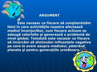 Documentul subliniază importanța conștientizării impactului activităților umane asupra mediului și necesitatea de a acționa pentru a diminua efectele negative. Activitățile propuse includ drumeții, confecționarea de obiecte din materiale refolosibile și plantarea de flori, având scopul de a educa comunitatea despre problemele ecologice. De asemenea, se promovează valori precum utilizarea materialelor biodegradabile și economisirea resurselor.