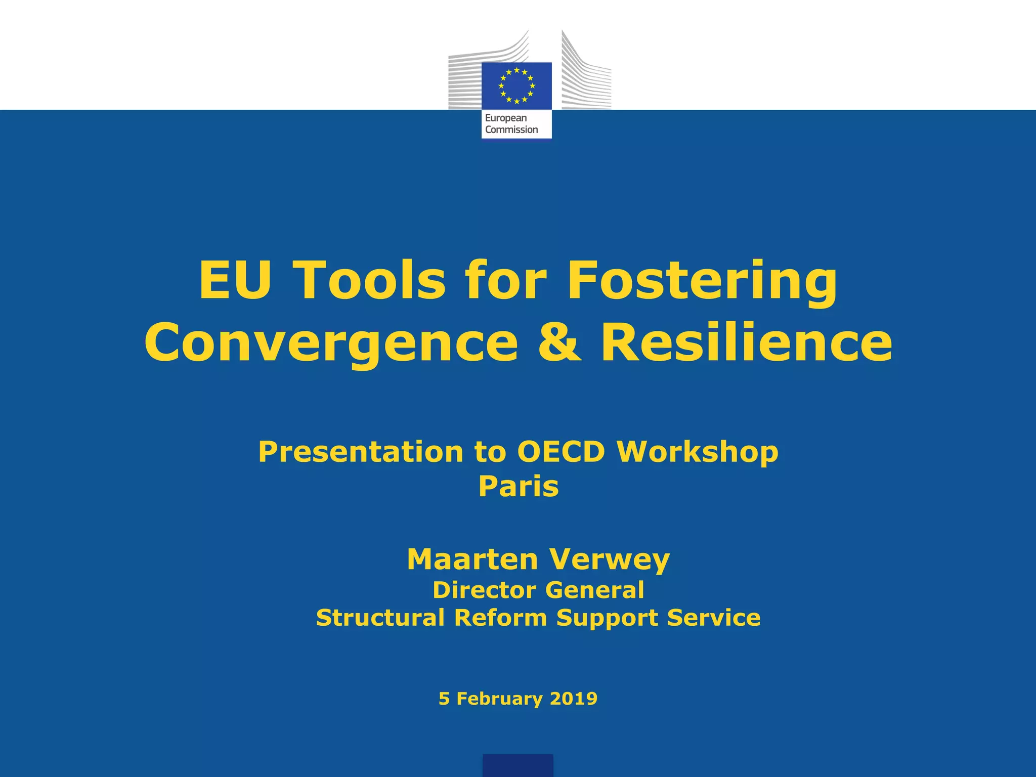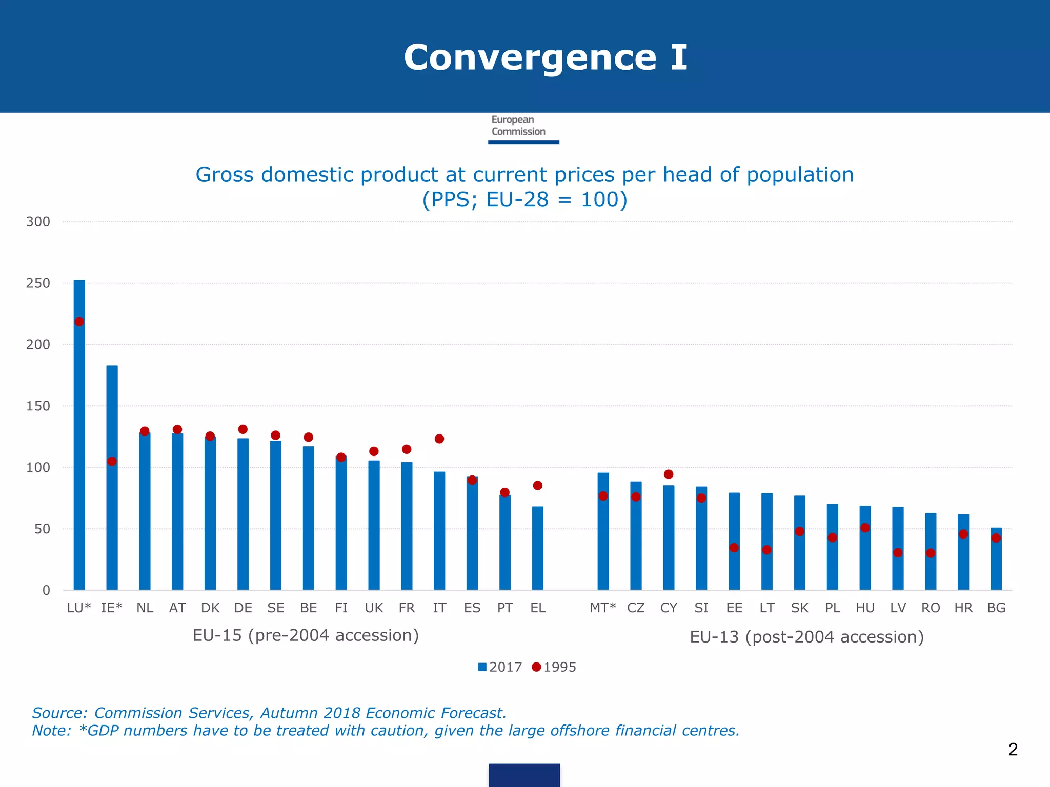 The document summarizes data on economic convergence, resilience, governance, and education outcomes across EU member states from 1995-2017. It shows that while GDP per capita has converged, with many central and eastern European countries catching up to western European levels, resilience to economic shocks and human capital outcomes still vary substantially across the EU. The document also describes European Commission programs that provide support to member states for structural economic reforms.