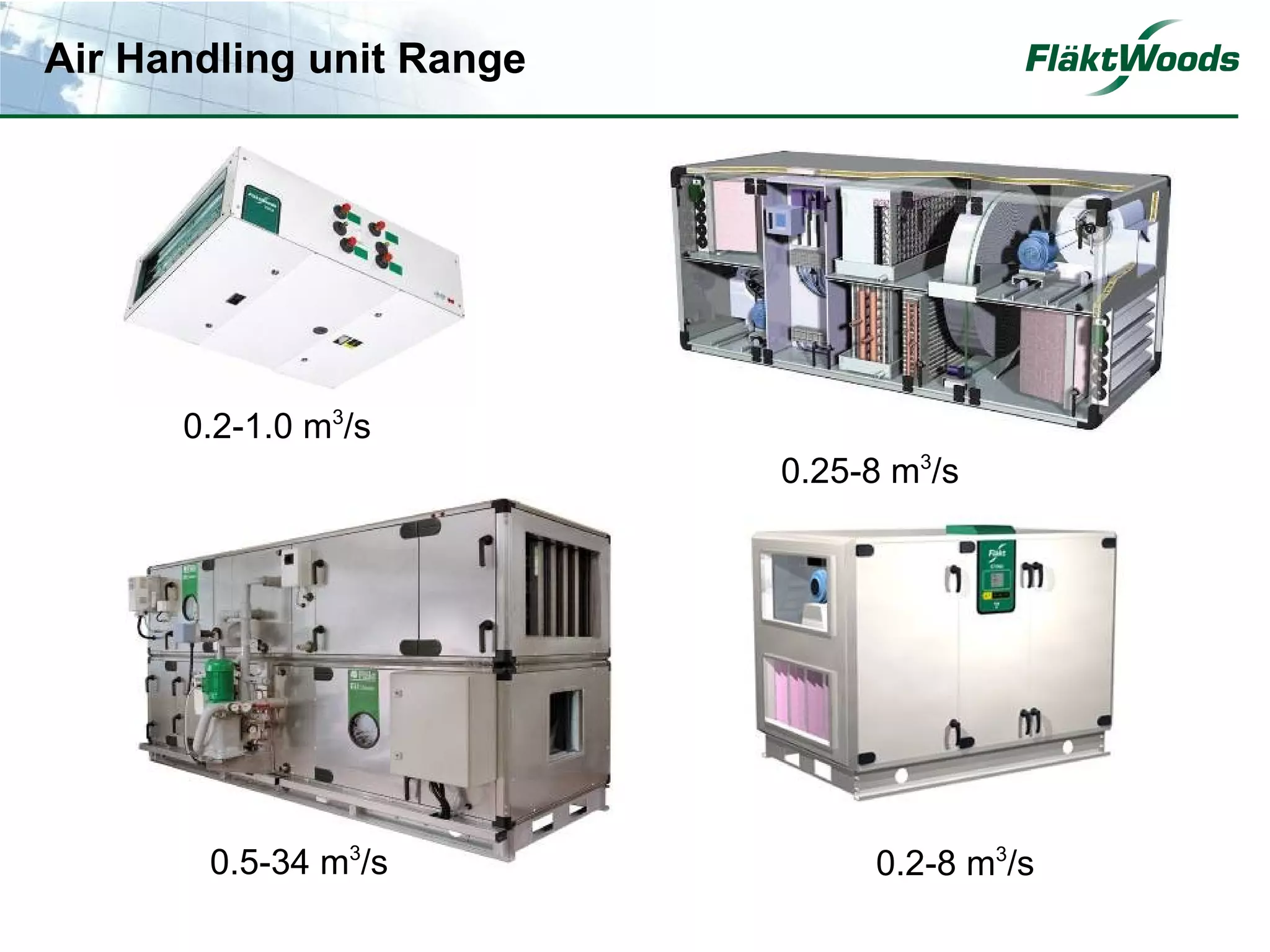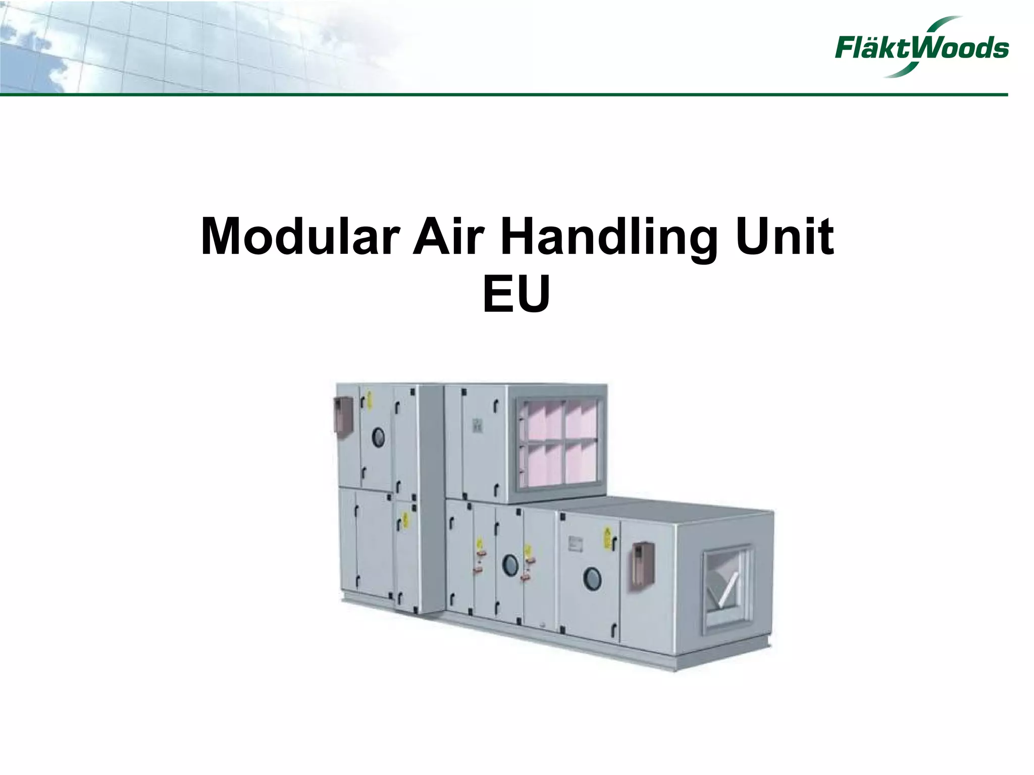 This document describes modular air handling units (AHUs) and their components. It discusses the EU size ranges from 0.2-34 m3/s and their casing, dampers, filters, coils, heat recovery, fans, and silencers. It provides details on materials, performance standards, installation, and maintenance for these various components. The purpose is to outline the technical specifications and options for modular AHUs to assist in selection and documentation.