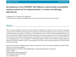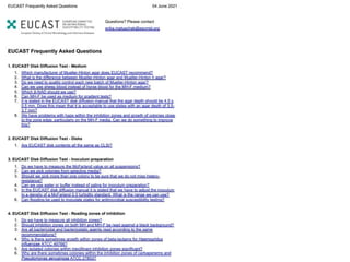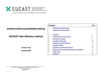 The document presents detailed guidelines on the EUCAST disk diffusion method for antimicrobial susceptibility testing, covering media preparation, inoculum preparation, and incubation conditions. It specifies the use of Mueller-Hinton agar for both non-fastidious and fastidious organisms, with specific recommendations for different bacteria types. The document emphasizes the importance of accuracy in measuring inhibition zones and the conditions for maintaining the quality of agar plates and antimicrobial disks.