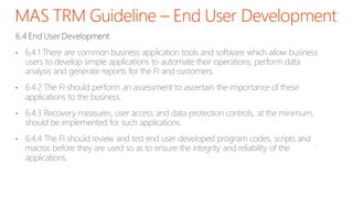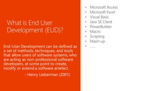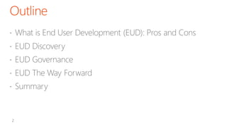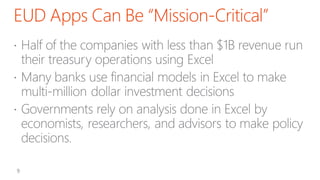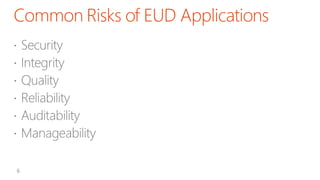 The document discusses the importance of managing end-user developed (EUD) tools and the associated risks, particularly regarding data governance and the potential for financial misstatements due to errors and fraud. It outlines Microsoft technologies as a solution for enabling EUD while minimizing risks through integrated monitoring, auditing, and security frameworks. The document also highlights best practices, tools for risk assessment, and the evolution of spreadsheet controls over the years.