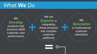 Eudata Videocare develops next-generation healthcare services, focusing on enhancing web customer care and remote patient examination through video support. Their solutions aim to improve service quality, reduce hospital visits, and expedite medical examinations while facilitating communication between patients and families. Eudata has been recognized by Gartner as a cool vendor in the CRM customer service sector and emphasizes the benefits of video communication in increasing consumer satisfaction.