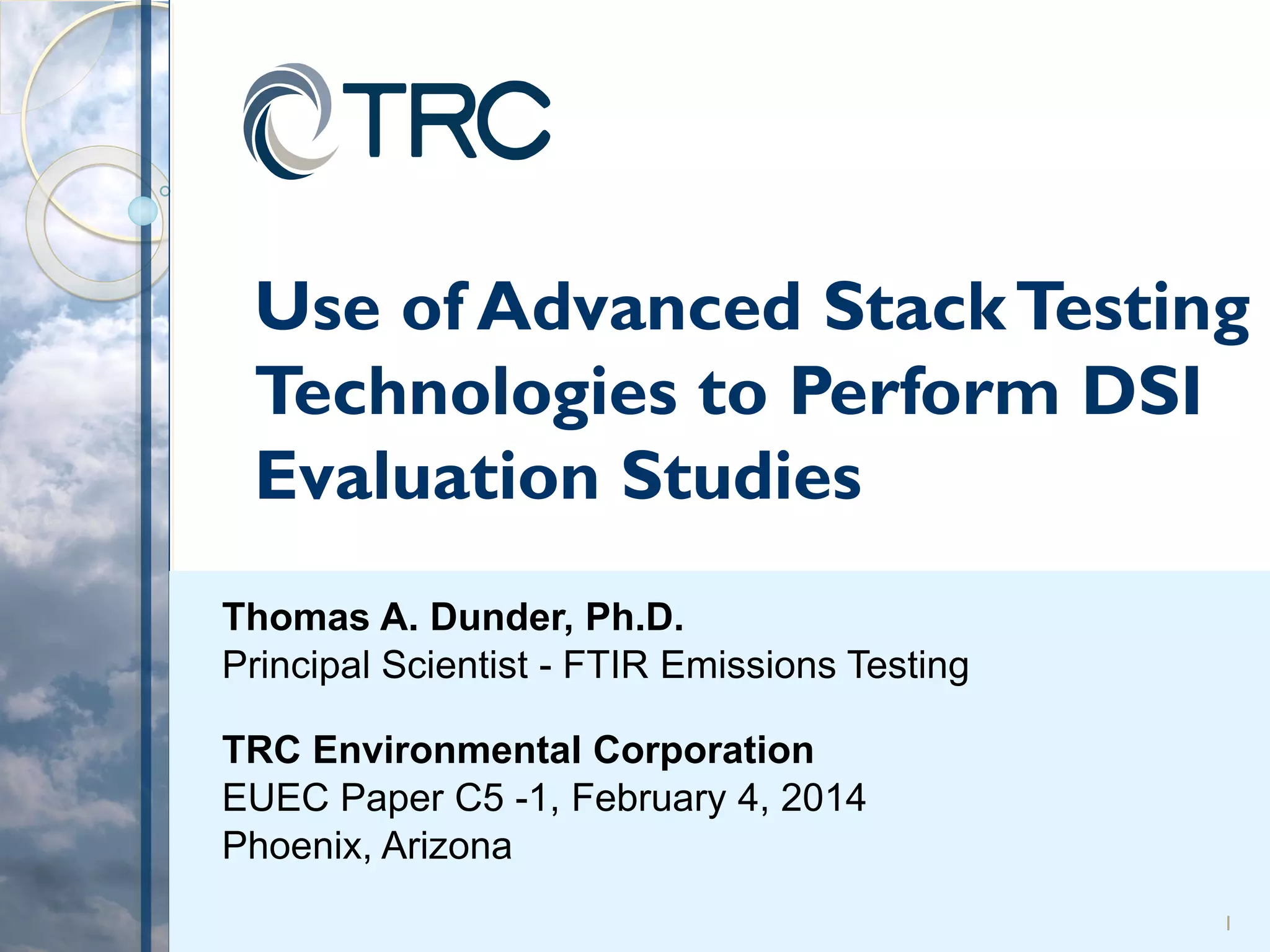 The document discusses the evaluation of dry sorbent injection (DSI) technologies for controlling emissions of sulfur dioxide, acid gases, and mercury in utilities. It emphasizes the need for accurate real-time data on removal efficiency, considering various factors such as sorbent type, injection rate, and testing methods. The paper highlights the importance of advanced stack testing techniques, like FTIR, to provide reliable data for optimal DSI performance.