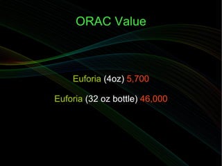 - Euforia is an organic supplement drink containing powerful antioxidants from ingredients like black seed, acai berry, turmeric, blueberry, and pomegranate. It has a high ORAC value and provides antioxidants equivalent to many servings of fruits and vegetables.