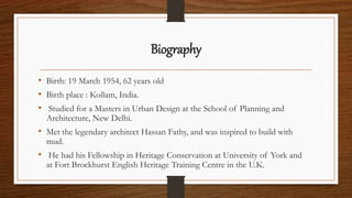 Eugene Pandala, an Indian architect born on March 19, 1954, is known for his eco-friendly designs that integrate natural materials and organic forms, inspired by his studies in urban design and heritage conservation. He gained recognition for his innovative use of mud in construction, creating buildings that harmonize with nature, such as the Ravi's House and Revathy Kala Mandir, a film academy designed with vastu shastra principles. His contributions have earned him numerous accolades, including the Laurie Baker Award and recognition from fellow architects in India.