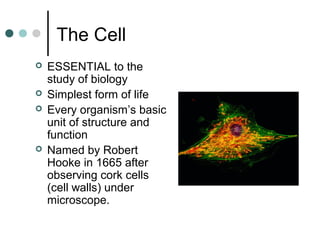 Eukaryotic cells have organelles that compartmentalize functions. Key organelles include the nucleus, which contains DNA; mitochondria and chloroplasts, which generate energy; and the endomembrane system of ER, Golgi, and vesicles, which modifies and transports proteins. The cytoskeleton, including microtubules, microfilaments, and intermediate filaments, maintains cell shape and enables movement. Plant cells have additional structures like cell walls and plasmodesmata between cells.