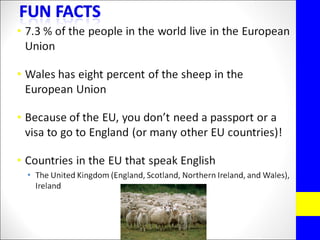 The European Union is a political and economic union of 27 member states that are located primarily in Europe. Countries join the EU to gain economic benefits and help, though they must agree to follow common rules and contribute financially through taxes. The EU began in 1957 with six founding members and has since expanded to include 27 countries, working together through institutions like the European Parliament and European Commission while maintaining cultural diversity.