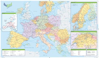 The document provides travel time information between various cities in Northern Europe by train. It includes a map showing distances between cities in kilometres and miles. Charts list specific travel times between pairs of cities in hours and minutes. Additional information includes reservation fees for different train lines between countries.