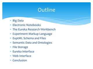 The document discusses the Eureka Research Workbench, an electronic laboratory notebook that utilizes a semantic approach to facilitate the management and sharing of scientific data through the Experiment Markup Language (ExptML) and RDF protocols. It emphasizes the challenges faced by academics in data sharing and the necessity for a user-friendly electronic notebook to properly document scientific workflows. The workbench integrates multiple data types and offers a web interface for efficient data retrieval and management, promoting collaboration and enhancement of research processes.
