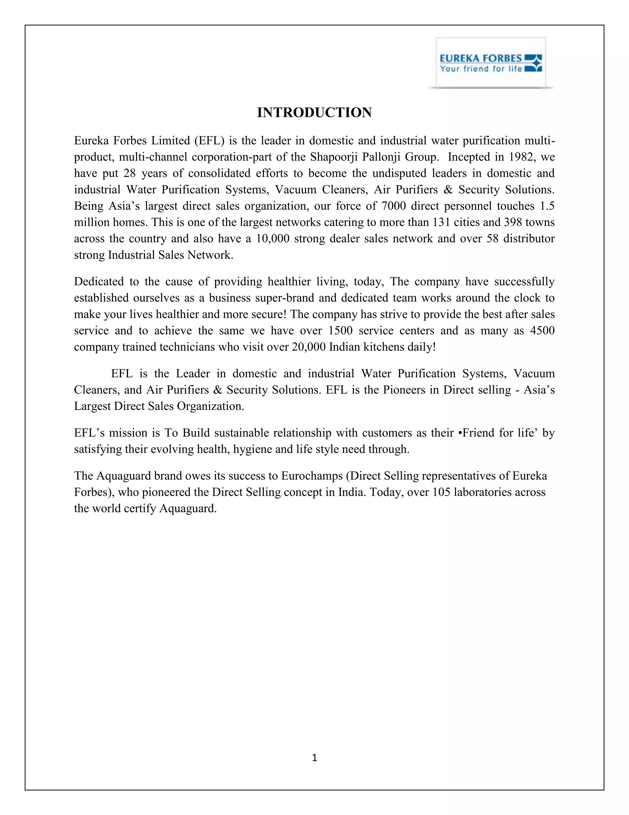 Eureka Forbes Limited is Asia's largest direct sales organization that provides water purification systems, vacuum cleaners, air purifiers, and security solutions. It has over 7,000 direct sales personnel serving 1.5 million homes across 131 cities and 398 towns in India. Eureka Forbes pioneered direct selling in India by marketing products like vacuum cleaners and water purifiers through demonstrations in homes. Known for its friendly sales representatives called "Eurochamps", Eureka Forbes established itself as a trusted brand in India. The company faced losses in the early 1990s but its products gained widespread acceptance, leading to increased sales. Eureka Forbes offers various water purifiers and vacuum cleaners targeted at different income groups and