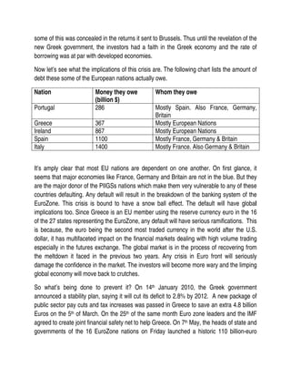 The debt crisis began in Greece in late 2009 when the new government revealed the budget deficit was much higher than previously reported. This undermined market confidence in Greece and caused borrowing rates to rise sharply. The crisis spread to other European nations like Portugal, Ireland, Spain and Italy who had taken on large debts. A bailout package was created by the IMF and Eurozone nations to help Greece, but long term solutions are still needed to restore confidence and prevent the crisis from worsening or spreading further. National austerity measures are being implemented but more fiscal coordination between European states may be required to contain the problem.