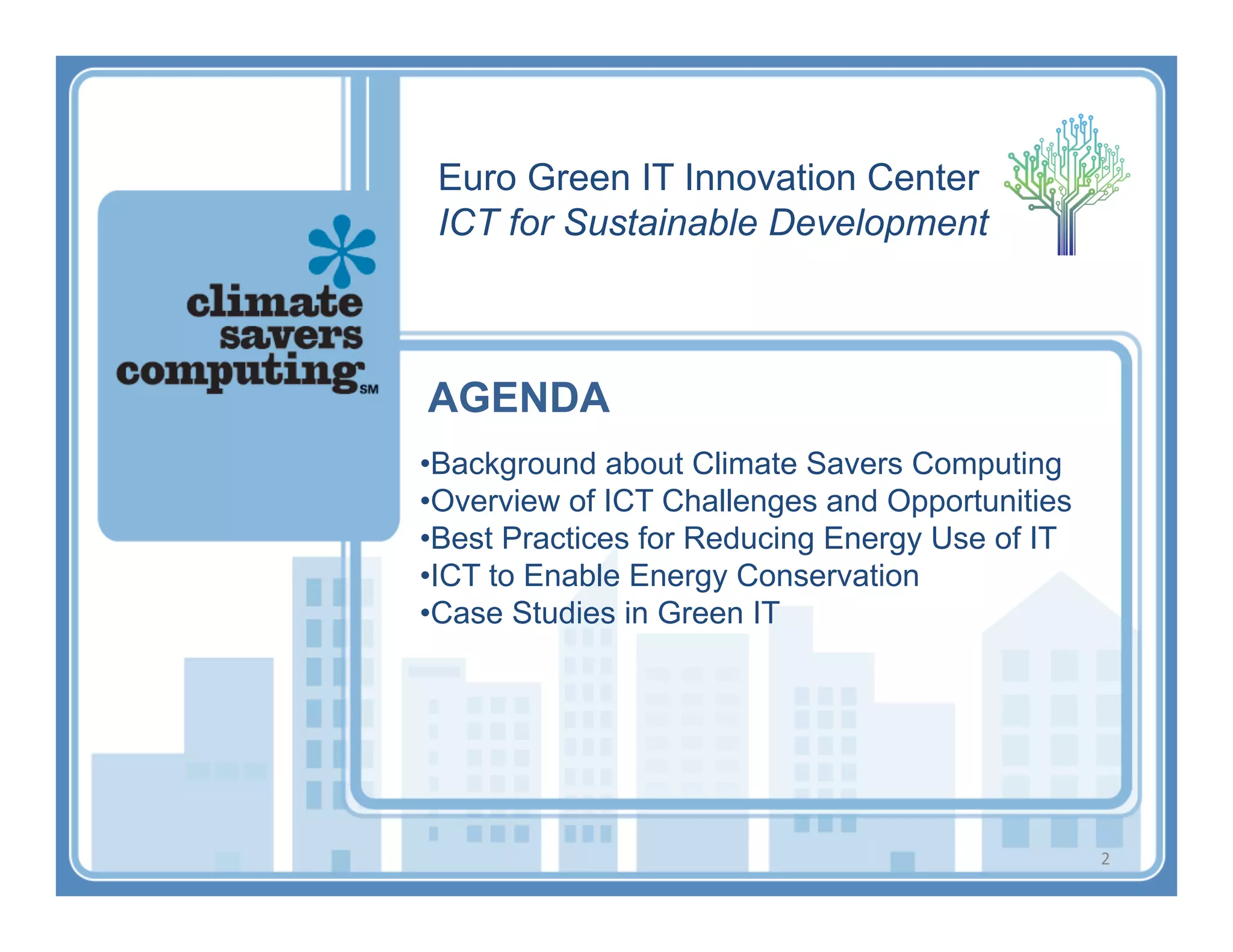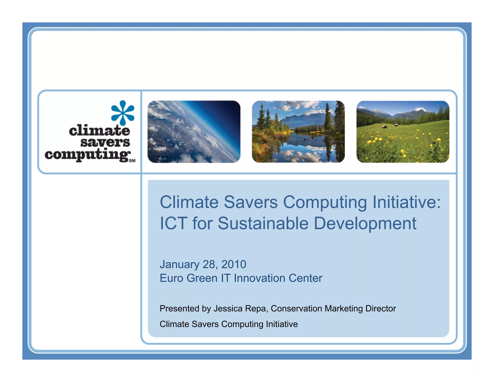 The Climate Savers Computing Initiative aims to enhance energy efficiency in computing to reduce global CO2 emissions by 54 million tons by 2010. The document outlines best practices, case studies, and opportunities for information and communication technology (ICT) to support sustainable development and energy conservation. It emphasizes the importance of user behavior and partnerships in driving significant energy savings and environmental benefits.