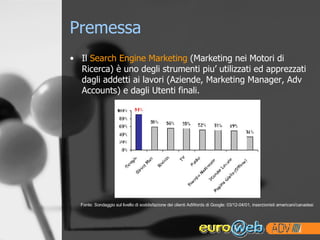 Il documento tratta dell'importanza del marketing nei motori di ricerca e di Google AdWords come strumento efficace per le aziende. Sottolinea che un buon posizionamento nei motori non garantisce contatti e suggerisce l'uso di landing page professionali per ottimizzare le campagne pubblicitarie online. Inoltre, evidenzia la necessità di un aggiornamento costante e della coerenza tra ricerca e contenuti del sito per attrarre clienti.