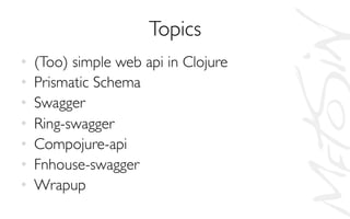- The document discusses using Prismatic Schema and Swagger to describe, validate, and document Clojure web APIs. It covers topics like Schema validation and coercion, Ring-Swagger, Compojure-API, and Fnhouse-Swagger integration.