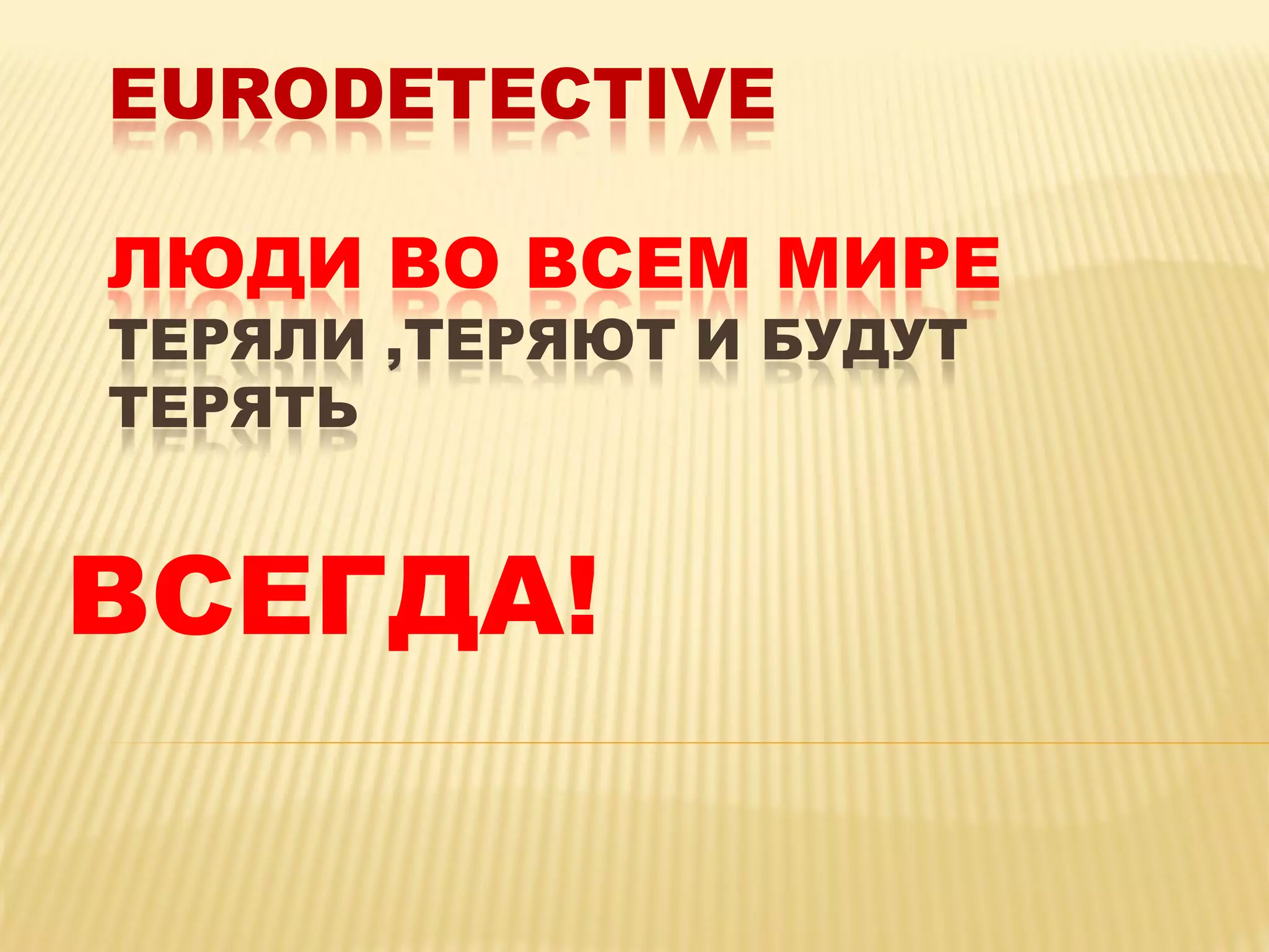 Документ описывает бизнес-идею компании Eurodetective, направленную на помощь людям в поиске потерянных вещей с использованием многоязычного подхода. Опрос показал, что около 20% жителей Европейского Союза ежемесячно теряют какие-либо вещи, что создает спрос на сервис, который соединяет потерявших и нашедших, сохраняя конфиденциальность. Проект основан на запатентованном методе и имеет потенциал для создания нового рынка услуг по возврату утраченных предметов.