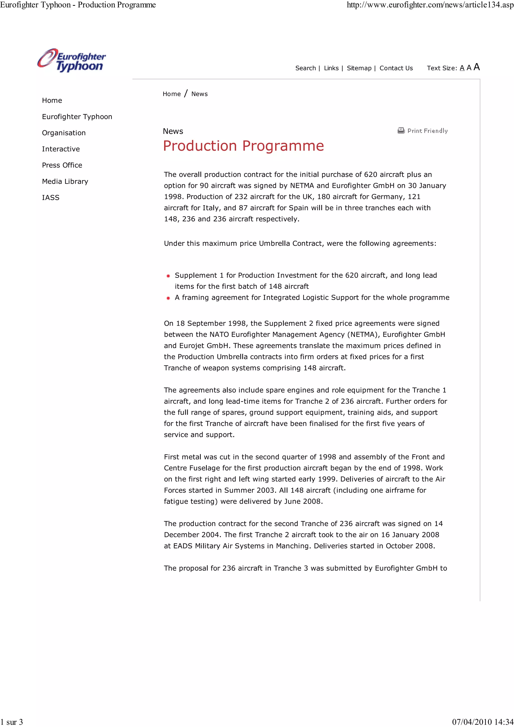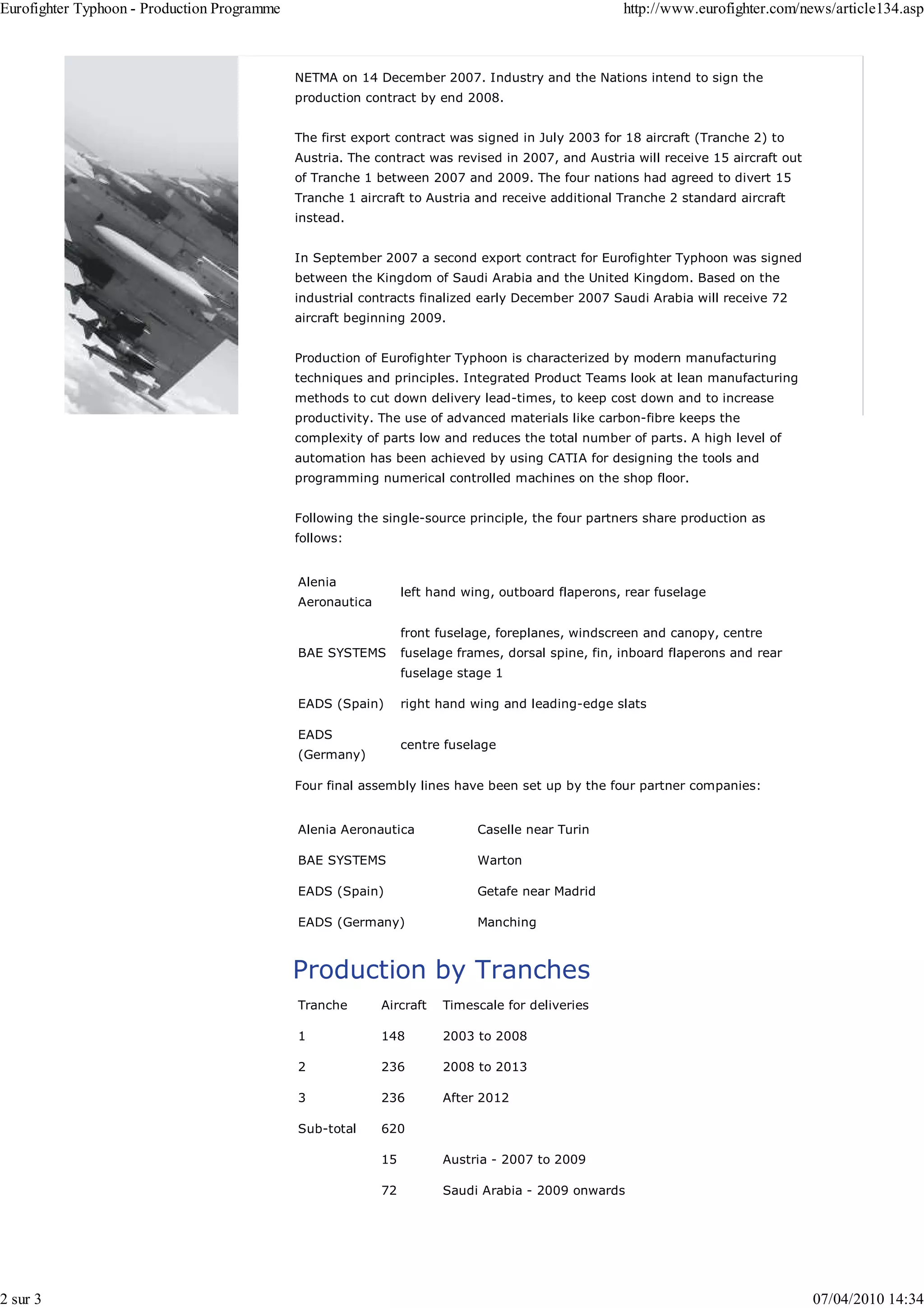 The document summarizes the production program for the Eurofighter Typhoon fighter jet. It details the contracts signed in 1998 for 620 initial aircraft plus an option for 90 more between the UK, Germany, Italy, and Spain. Production is split among the four partner countries and takes place in three tranches, with the first 148 aircraft delivered between 2003-2008. Export contracts have also been signed with Austria for 15 aircraft and Saudi Arabia for 72 aircraft.