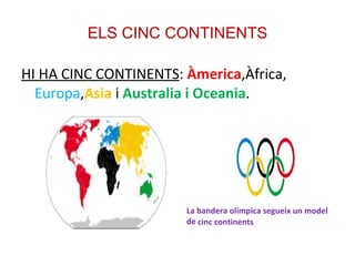 ELS CINC CONTINENTSHI HA CINC CONTINENTS : Àmerica ,Àfrica, Europa , Asia i Australia i Oceania . La bandera olímpica segueix un model de cinc continents
